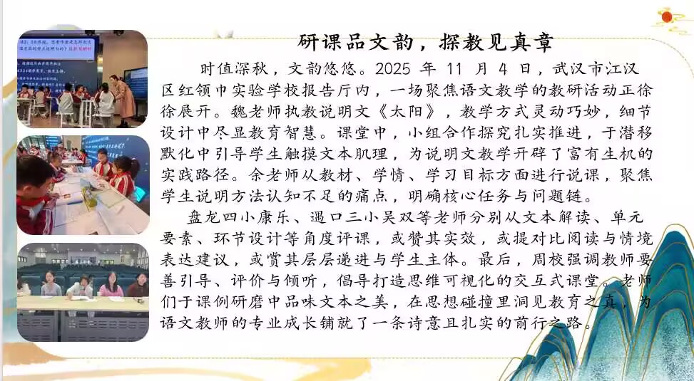 研课品文韵,探教见真章 时值深秋,文韵悠悠。2025年11月4日,武汉市江汉区红领巾实验学校报告厅内,一场聚焦语文教学的教研活动正徐徐展开。魏老师执教说明文《太阳》,教学方式灵动巧妙,细节设计中尽显